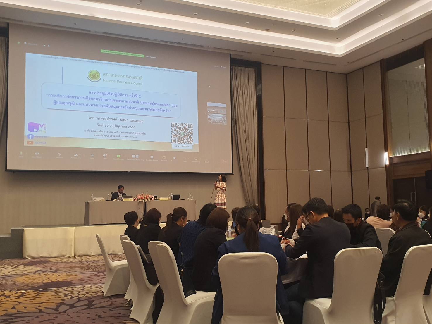 ในระหว่างวันที่ 19-20 มิถุนายน 2566 ณ ห้องไฮเดรนเยีย 2-3 โรงแรมทีเค พาเลซ แอนด์ คอนเวนชั่น ถนนแจ้งวัฒนะ เขตหลักสี่ กรุงเทพมหานคร นางสาวชมพูนุช ญาณะนันท์ หัวหน้าสำนักงานสภาเกษตรกรจังหวัดมหาสารคาม พร้อมด้วยพนักงานฯ เข้าร่วมการประชุมเชิงปฏิบัติการ ครั้งที่ 2 “การบริหารจัดการการเลือกสมาชิกสภาเกษตรกรแห่งชาติ ประแทนผู้แทนองค์กรและผู้ทรงคุณวุฒิ และแนวทางการสนับสนุนการจัดประชุมสภาเกษตรกรจังหวัดและสภาเกษตรกรแห่งชาติ” โดยรับฟังการบรรยายในหัวข้อการจัดทำข้อเสนอเชิงนโยบาย เพื่อพัฒนาเกษตรกรรมของประเทศ Workshop 2 – 5 และแนวทางการถ่ายทอดข้อเสนอเชิงนโยบาย เพื่อสนับสนุนการจัดประชุมสภาเกษตรกรจังหวัดในการพัฒนาเกษตรกรรมของประเทศ รวมถึงแนวทางการรายงานผลการเลือกตั้ง การจัดเก็บเอกสาร และการส่งเงินคืน เงินงบประมาณ (งบกลาง) รายการเงินสำรองจ่ายเพื่อกรณีฉุกเฉินหรือจำเป็นเพื่อเป็นค่าใช้จ่ายในการเลือกตั้งฯ