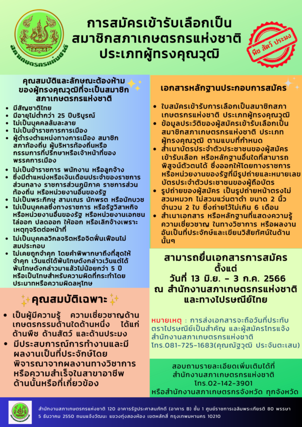 📣 ขอเชิญชวนเกษตรกรผู้สนใจสมัครเข้ารับเลือกเป็นสมาชิกสภาเกษตรกรแห่งชาติ ประเภทผู้ทรงคุณวุฒิ เปิดรับสมัครตั้งแต่ 13 มิถุนายน ถึง 3 กรกฎาคม 2566