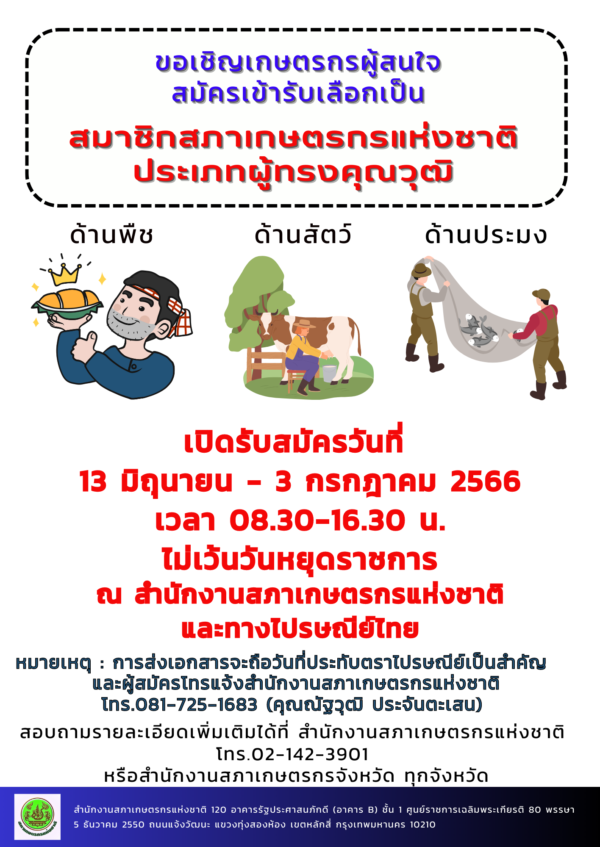 📣 ขอเชิญชวนเกษตรกรผู้สนใจสมัครเข้ารับเลือกเป็นสมาชิกสภาเกษตรกรแห่งชาติ ประเภทผู้ทรงคุณวุฒิ เปิดรับสมัครตั้งแต่ 13 มิถุนายน ถึง 3 กรกฎาคม 2566