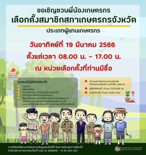 ขอเชิญชวนเกษตรกรผู้สิทธิเลือกตั้ง ไปใช้สิทธิ์เลือกตั้งสมาชิกสภาเกษตรกร ประเภทผู้แทนเกษตรกรจังหวัด ในวันอาทิตย์ที่ 19 มีนาคม 2566 14 มี.ค. 25667 พ.ย. 2025Adminitratorข่าวกิจกรรม, ข่าวประชาสัมพันธ์