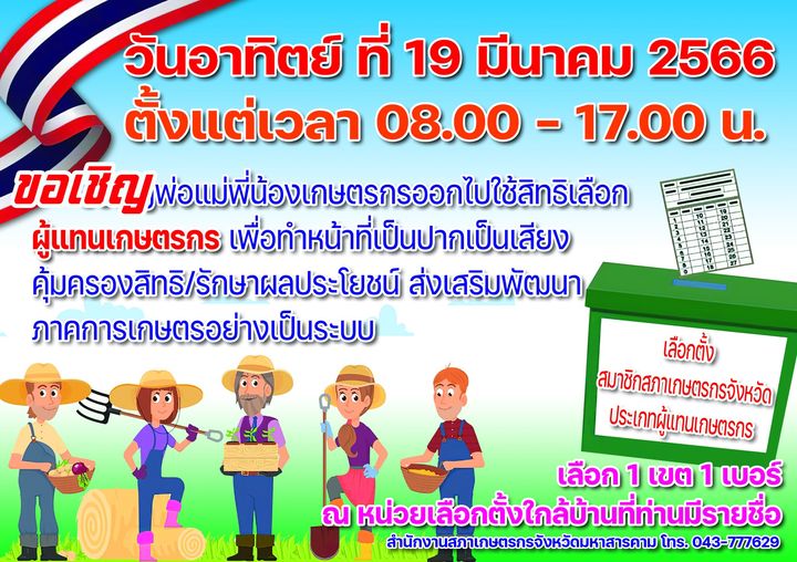 ขอเชิญชวนเกษตรกรผู้สิทธิเลือกตั้ง ไปใช้สิทธิ์เลือกตั้งสมาชิกสภาเกษตรกร ประเภทผู้แทนเกษตรกรจังหวัด ในวันอาทิตย์ที่ 19 มีนาคม 2566 16 มี.ค. 25667 พ.ย. 2025Adminitratorข่าวกิจกรรม, ข่าวประชาสัมพันธ์