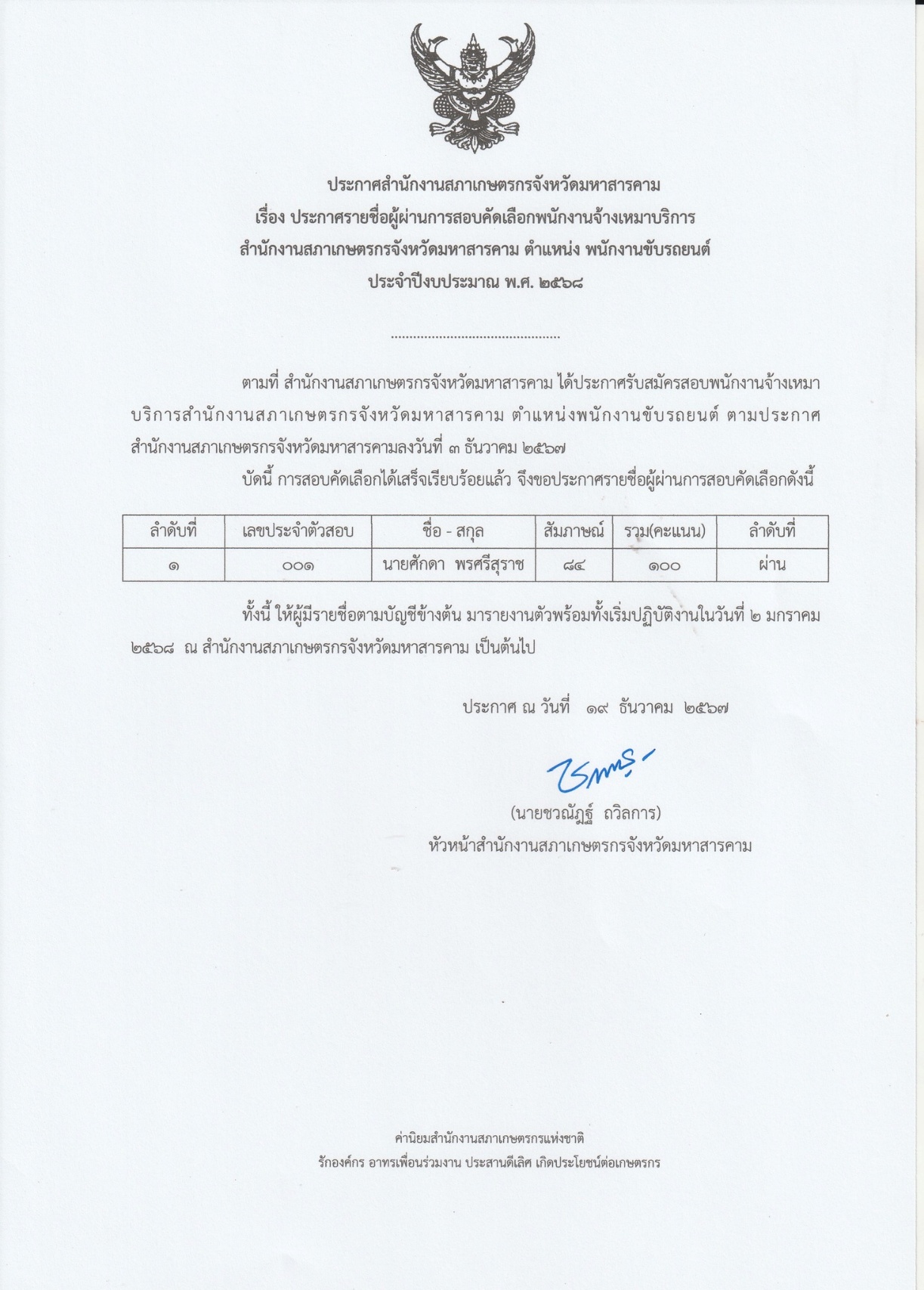 ประกาศสำนักงานสภาเกษตรกรจังหวัดมหาสารคาม เรื่อง ประกาศรายชื่อผู้ผ่านการสอบคัดเลือกพนักงานจ้างเหมาบริการสำนักงานสภาเกษตรกรจังหวัดมหาสารคาม ตำแหน่ง พนักงานขับรถยนต์ ประจำปีงบประมาณ พ.ศ.2568