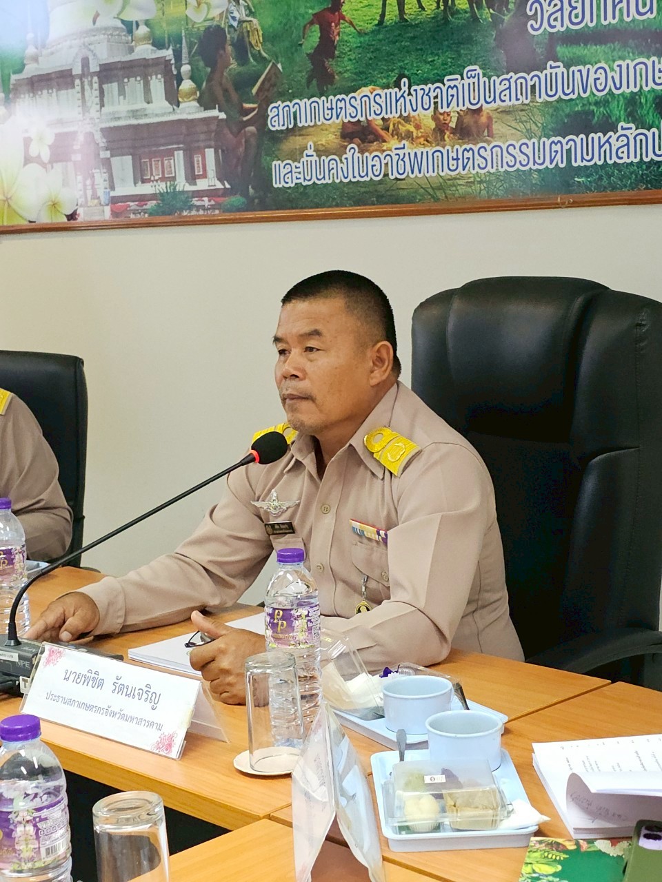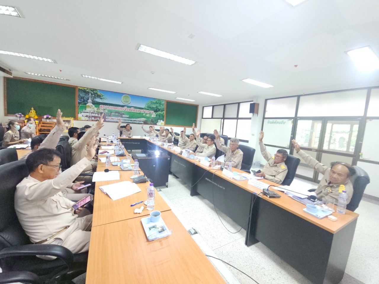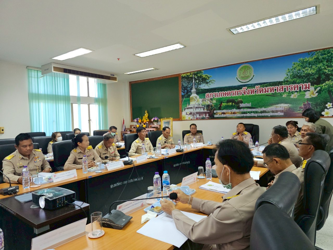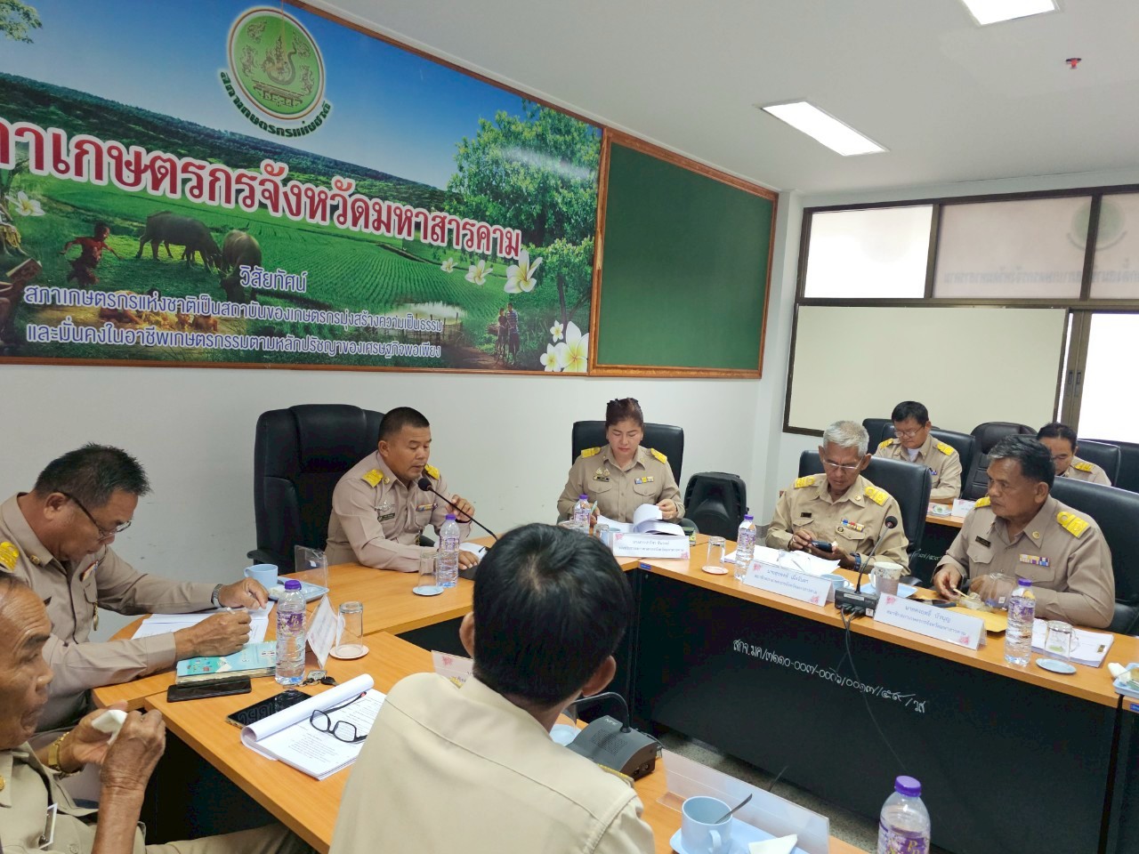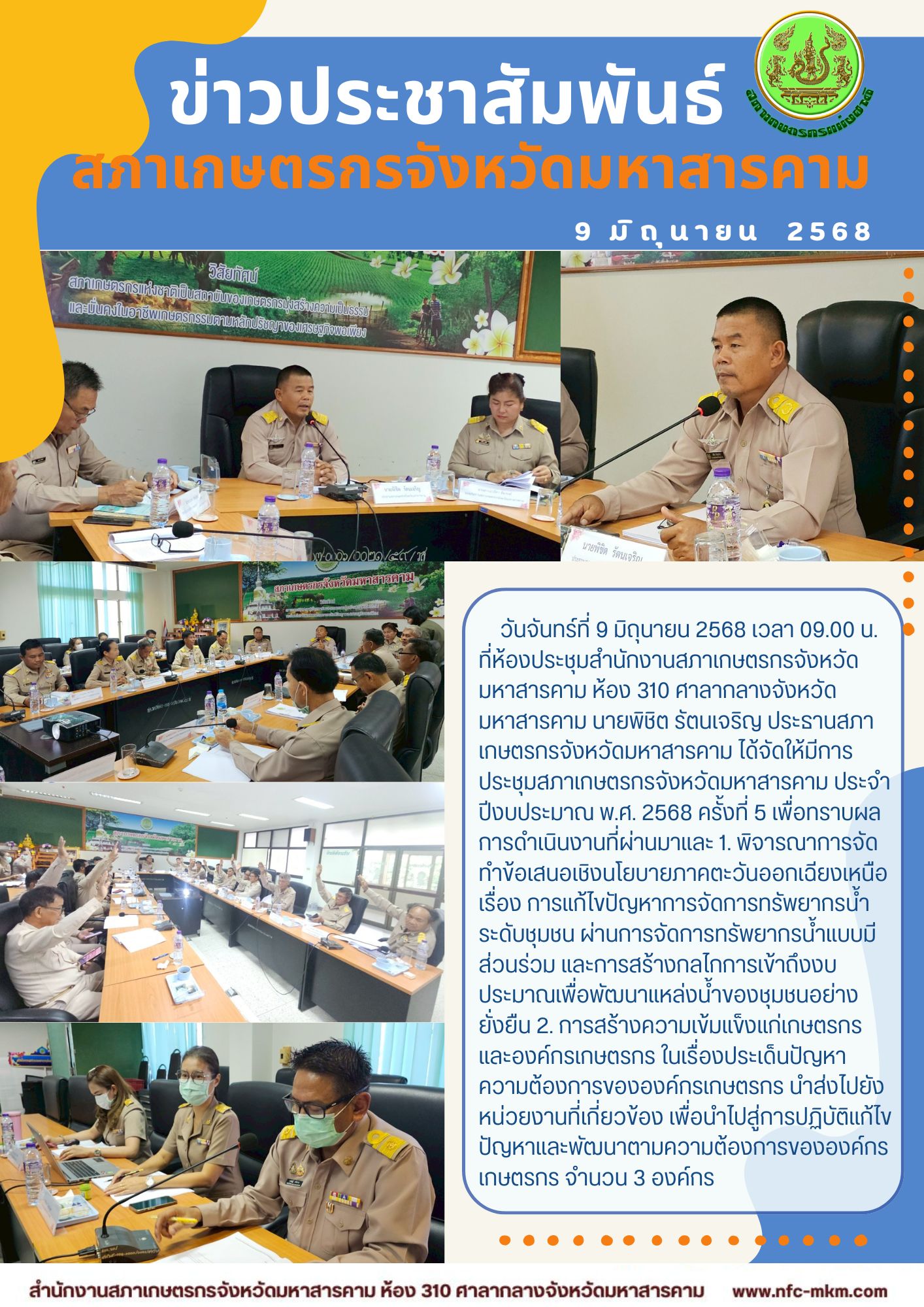 วันจันทร์ที่ 9 มิถุนายน 2568 เวลา 09.00 น. ที่ห้องประชุมสำนักงานสภาเกษตรกรจังหวัดมหาสารคาม ห้อง 310 ศาลากลางจังหวัดมหาสารคาม นายพิชิต รัตนเจริญ ประธานสภาเกษตรกรจังหวัดมหาสารคาม ได้จัดให้มีการประชุมสภาเกษตรกรจังหวัดมหาสารคาม ประจำปีงบประมาณ พ.ศ. 2568 ครั้งที่ 5 เพื่อทราบผลการดำเนินงานที่ผ่านมาและ 1. พิจารณาการจัดทำข้อเสนอเชิงนโยบายภาคตะวันออกเฉียงเหนือ เรื่อง การแก้ไขปัญหาการจัดการทรัพยากรน้ำระดับชุมชน ผ่นการจัดการทรัพยากรน้ำแบบมีส่วนร่วม และการสร้างกลไกการเข้าถึงงบประมาณเพื่อพัฒนาแหล่งน้ำของชุมชนอย่างยั่งยืน 2. การสร้างความเข้มแข็งแก่เกษตรกรและองค์กรเกษตรกร ในเรื่องประเด็นปัญหาความต้องการขององค์กรเกษตรกร นำส่งไปยังหน่วยงานที่เกี่ยวข้อง เพื่อนำไปสู่การปฏิบัติแก้ไขปัญหาและพัฒนาตามความต้องการขององค์กรเกษตรกร จำนวน 3 องค์กร