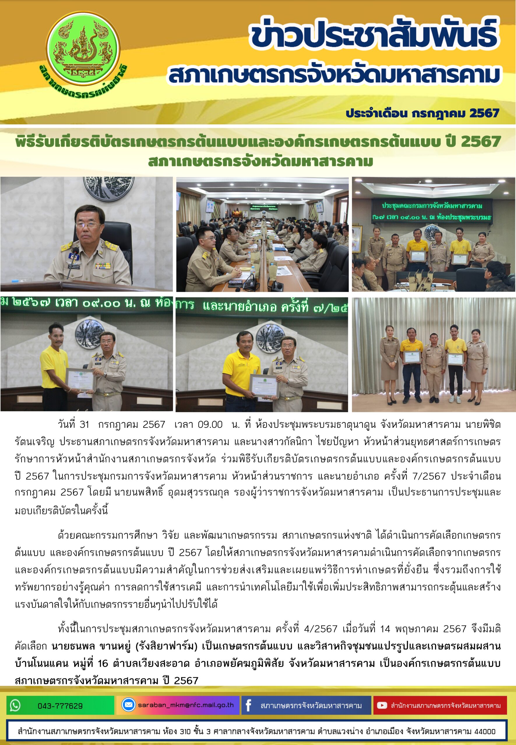 พิธีรับเกียรติบัตรเกษตรกรต้นแบบและองค์กรเกษตรกรต้นแบบ ปี 2567 สภาเกษตรกรจังหวัดมหาสารคาม
