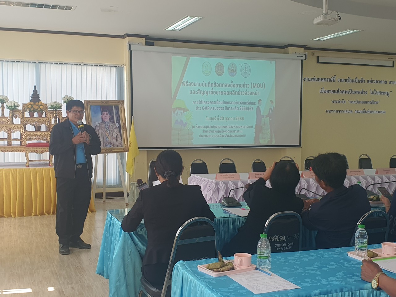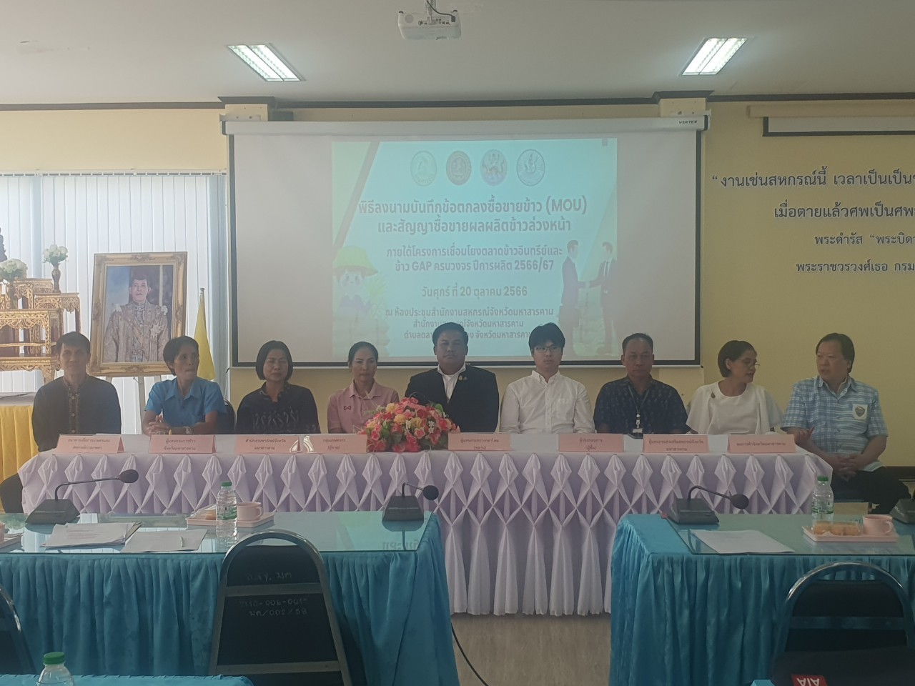 วันที่ 20 ตุลาคม 2566 เวลา 09.00 น. ณ ห้องประชุมสำนักงานสหกรณ์จังหวัดมหาสารคาม สำนักงานสหกรณ์จังหวัดมหาสารคาม ตำบลตลาด อำเภอเมือง จังหวัดมหาสารคาม นางสาวชมพูนุช ญาณะนันท์ หัวหน้าสำนักงานสภาเกษตรกรจังหวัดมหาสารคาม มอบหมายให้ นางสาวกัลนิกา ไชยปัญหา หัวหน้าส่วนยุทธศาสตร์การเกษตร เข้าร่วมการประชุมชี้แจงและการบันทึกข้อตกลงซื้อขายข้าว (MOU) และสัญญาซื้อขายผลผลิตข้าวล่วงหน้า ภายใต้โครงการเชื่อมโยงตลาดข้าวอินทรีย์ และข้าว GAP ครบวงจร ปีการผลิต 2566/67