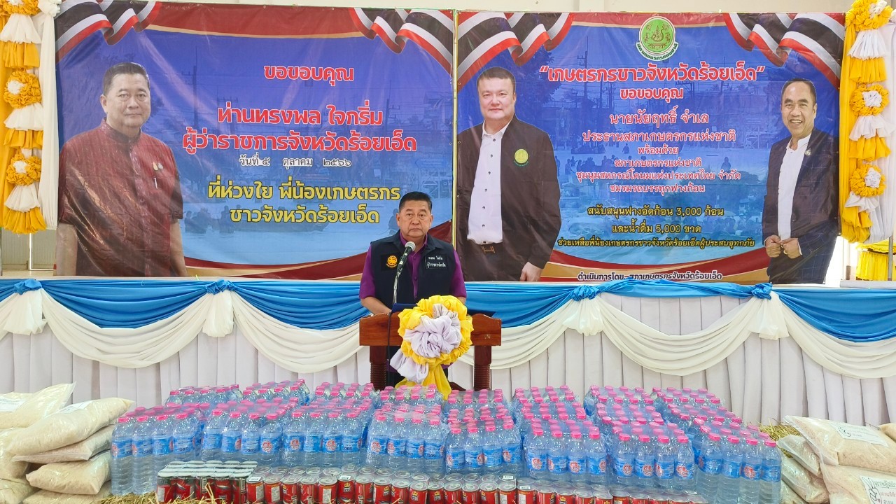 จังหวัดร้อยเอ็ด ได้ประสบสถานการณ์ฝนตกหนักต่อเนื่อง จากอิทธิพลร่องมรสุมกำลังแรง ในช่วงวันที่ 3 – 6 กันยายน 2566 ที่ผ่านมา บริเวณต้นน้ำยังตอนบนทำให้ปริมาณน้ำสะสม และเป็นเหตุให้ระดับน้ำเพิ่มสูงขึ้นอย่างรวดเร็วและต่อเนื่องจากสาเหตุดังกล่าวส่งผลให้เมื่อวันที่ 6 กันยายน 2566 จังหวัดร้อยเอ็ด ได้เกิดสถานการณ์อุทกภัยจากลำนายังเอ่อล้นตลิ่งขึ้น อีกทั้งยังมีฝนตกต่อเนื่องในพื้นที่ทำให้บ้านเรือนราษฎรสิ่งสาธารณประโยชน์ รวมทั้งพื้นที่ทางการเกษตร ประมง ปศุสัตว์ถูกน้ำท่วมขัง สภาเกษตรกรจังหวัดร้อยเอ็ด ได้ตระหนักถึงการให้ความช่วยเหลือพี่น้องเกษตรกรที่ได้รับความเดือดร้อนจากอุทกภัย