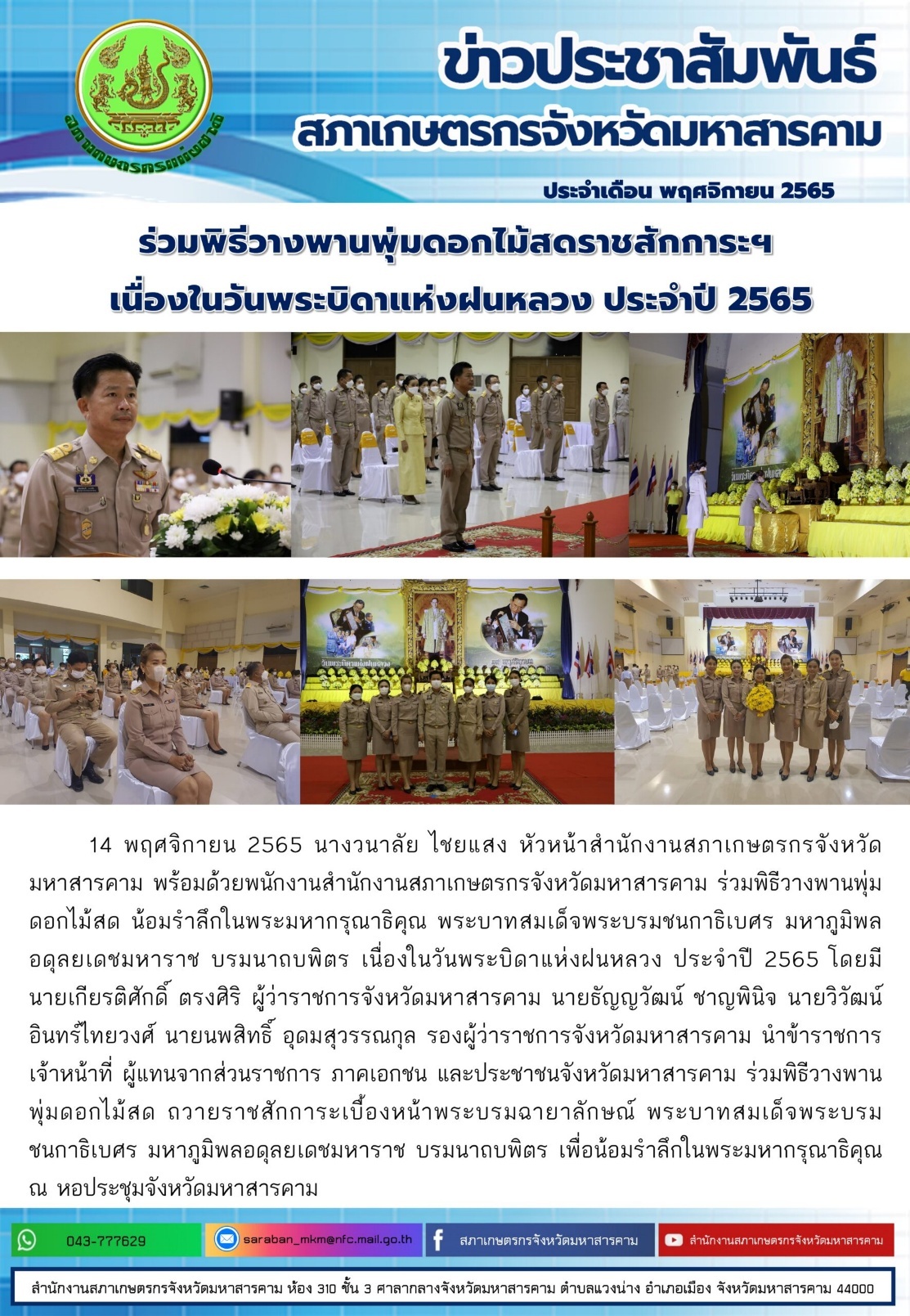 ร่วมพิธีวางพานพุ่มดอกไม้สดราชสักการะฯ เนื่องในวันพระบิดาแห่งฝนหลวง ประจำปี 2565 14 พ.ย. 25657 พ.ย. 2025Adminitratorข่าวกิจกรรม, ข่าวประชาสัมพันธ์