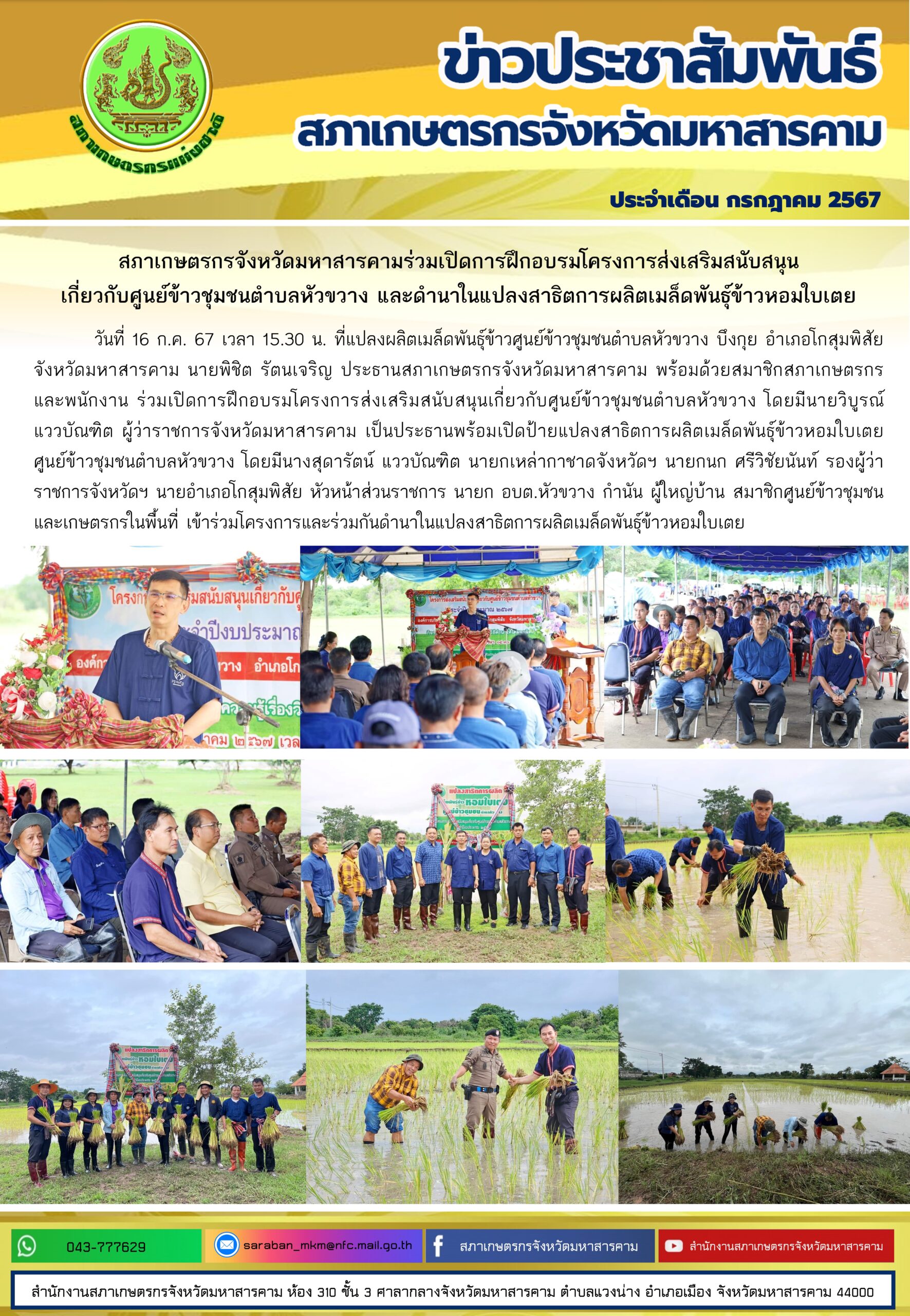สภาเกษตรกรจังหวัดมหาสารคามร่วมเปิดการฝึกอบรมโครงการส่งเสริมสนับสนุนเกี่ยวกับศูนย์ข้าวชุมชนตำบลหัวขวาง และดำนาในแปลงสาธิตการผลิตเมล็ดพันธุ์ข้าวหอมใบเตย