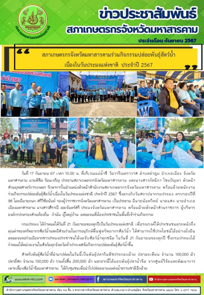 สภาเกษตรกรจังหวัดมหาสารคามร่วมกิจกรรมปล่อยพันธุ์สัตว์น้ำ เนื่องในวันประมงแห่งชาติ ประจำปี 2567 17 ส.ค. 25678 พ.ย. 2025Adminitratorข่าวประชาสัมพันธ์