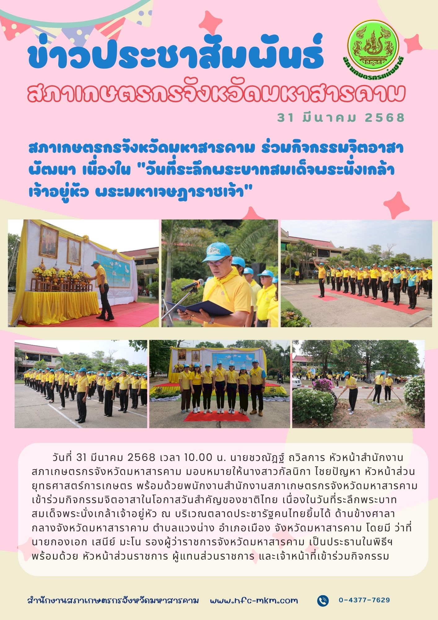 สภาเกษตรกรจังหวัดมหาสารคาม ร่วมกิจกรรมจิตอาสาพัฒนา เนื่องใน “วันที่ระลึกพระบาทสมเด็จพระนั่งเกล้าเจ้าอยู่หัว พระมหาเจษฎาราชเจ้า”