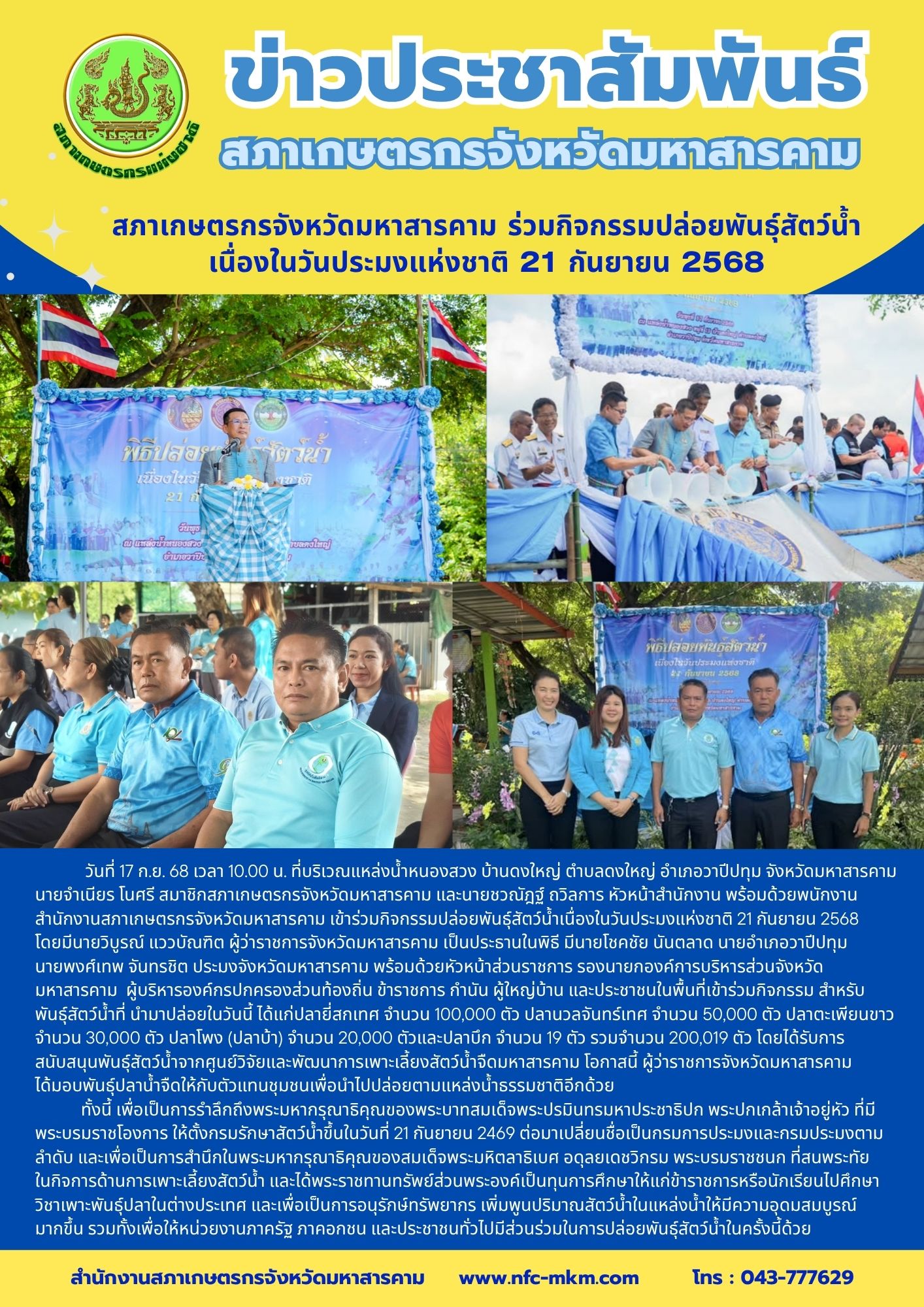 สภาเกษตรกรจังหวัดมหาสารคาม ร่วมกิจกรรมปล่อยพันธุ์สัตว์น้ำเนื่องในวันประมงแห่งชาติ 21 กันยายน 2568 21 ก.ย. 25688 พ.ย. 2025Adminitratorข่าวประชาสัมพันธ์