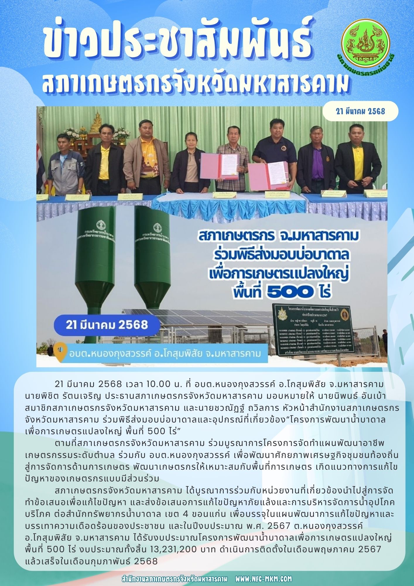 สภาเกษตรกร จ.มหาสารคาม ร่วมพิธีส่งมอบบ่อบาดาลและอุปกรณ์ที่เกี่ยวข้อง “โครงการพัฒนาน้ำบาดาลเพื่อการเกษตรแปลงใหญ่ พื้นที่ 500 ไร่” 21 มี.ค. 25688 พ.ย. 2025Adminitratorข่าวประชาสัมพันธ์