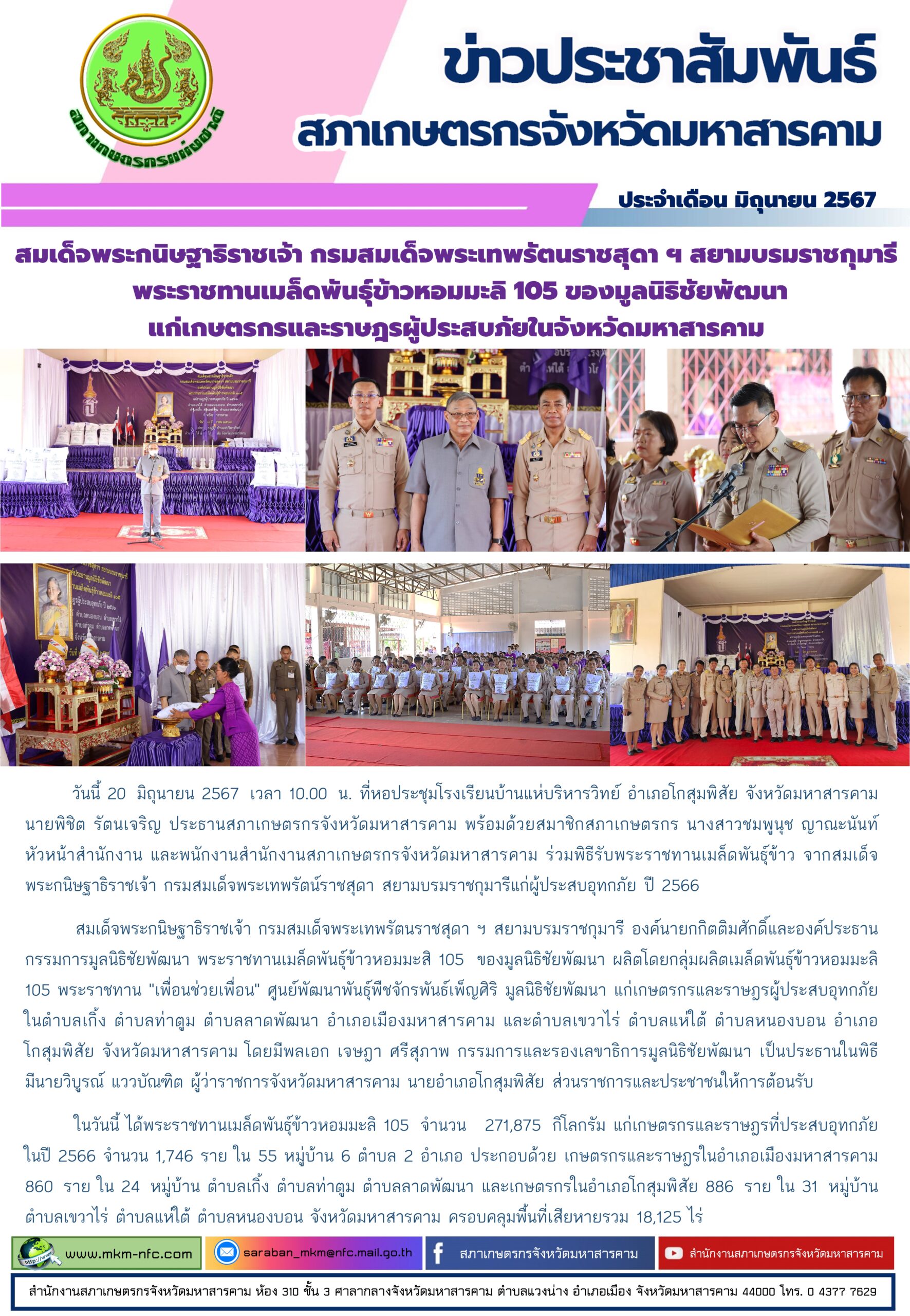 สมเด็จพระกนิษฐาธิราชเจ้า กรมสมเด็จพระเทพรัตนราชสุดา ฯ สยามบรมราชกุมารี พระราชทานเมล็ดพันธุ์ข้าวหอมมะลิ 105 ของมูลนิธิชัยพัฒนาแก่เกษตรกรและราษฎรผู้ประสบภัยในจังหวัดมหาสารคาม