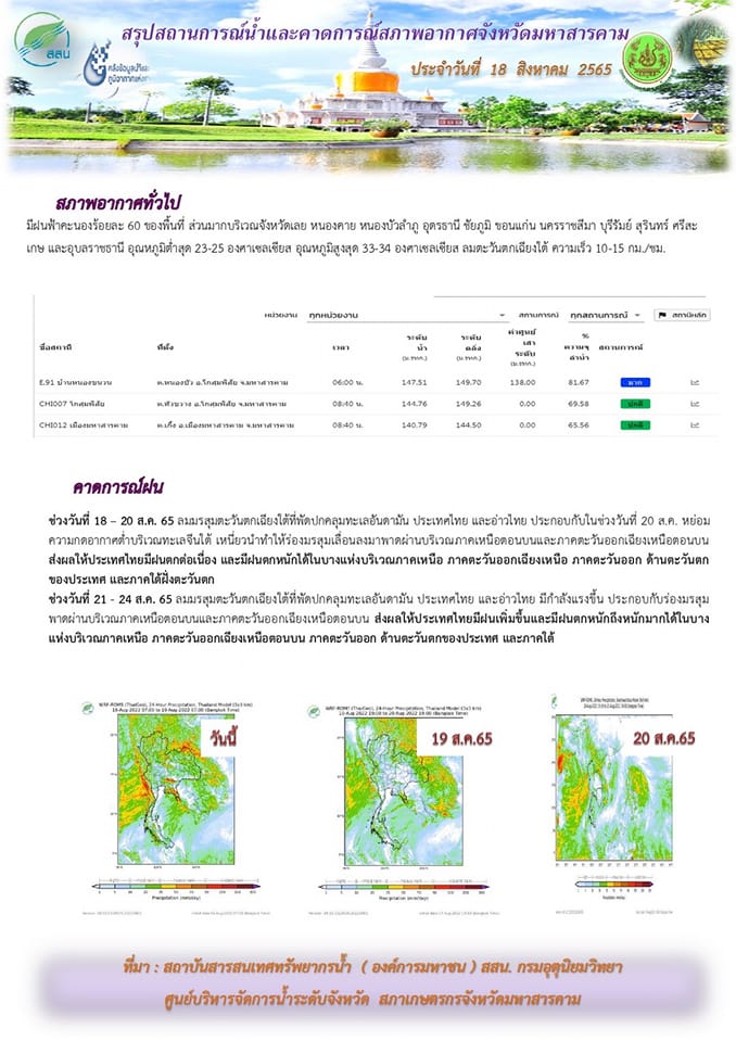 สรุปสถานการณ์น้ำและคาดการณ์สภาพอากาศจังหวัดมหาสารคาม 18 ส.ค. 25657 พ.ย. 2025Adminitratorข่าวกิจกรรม, ข่าวประชาสัมพันธ์ สรุปสถานการณ์น้ำและคาดการณ์สภาพอากาศจังหวัดมหาสารคาม