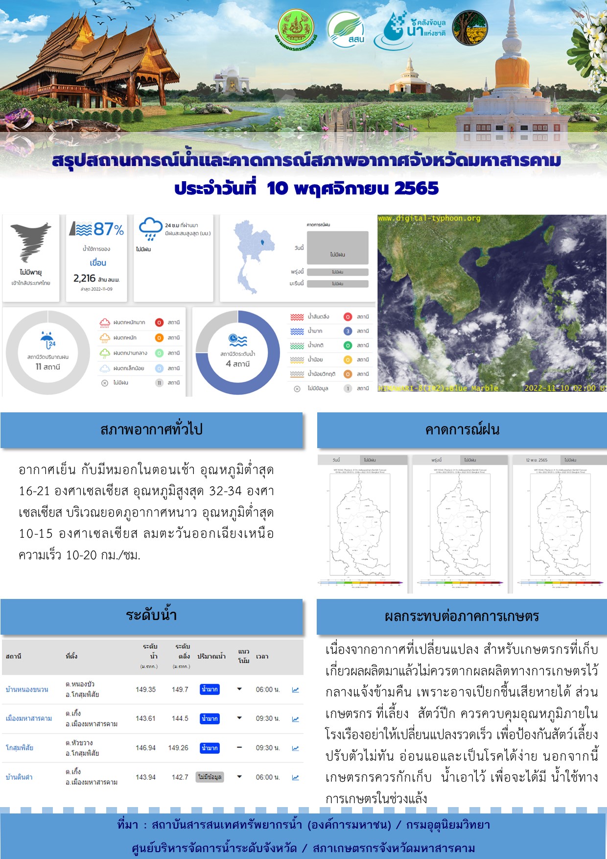 สรุปสถานการณ์น้ำและคาดการณ์สภาพอากาศจังหวัดมหาสารคาม 10 พ.ย. 25657 พ.ย. 2025Adminitratorข่าวกิจกรรม, ข่าวประชาสัมพันธ์