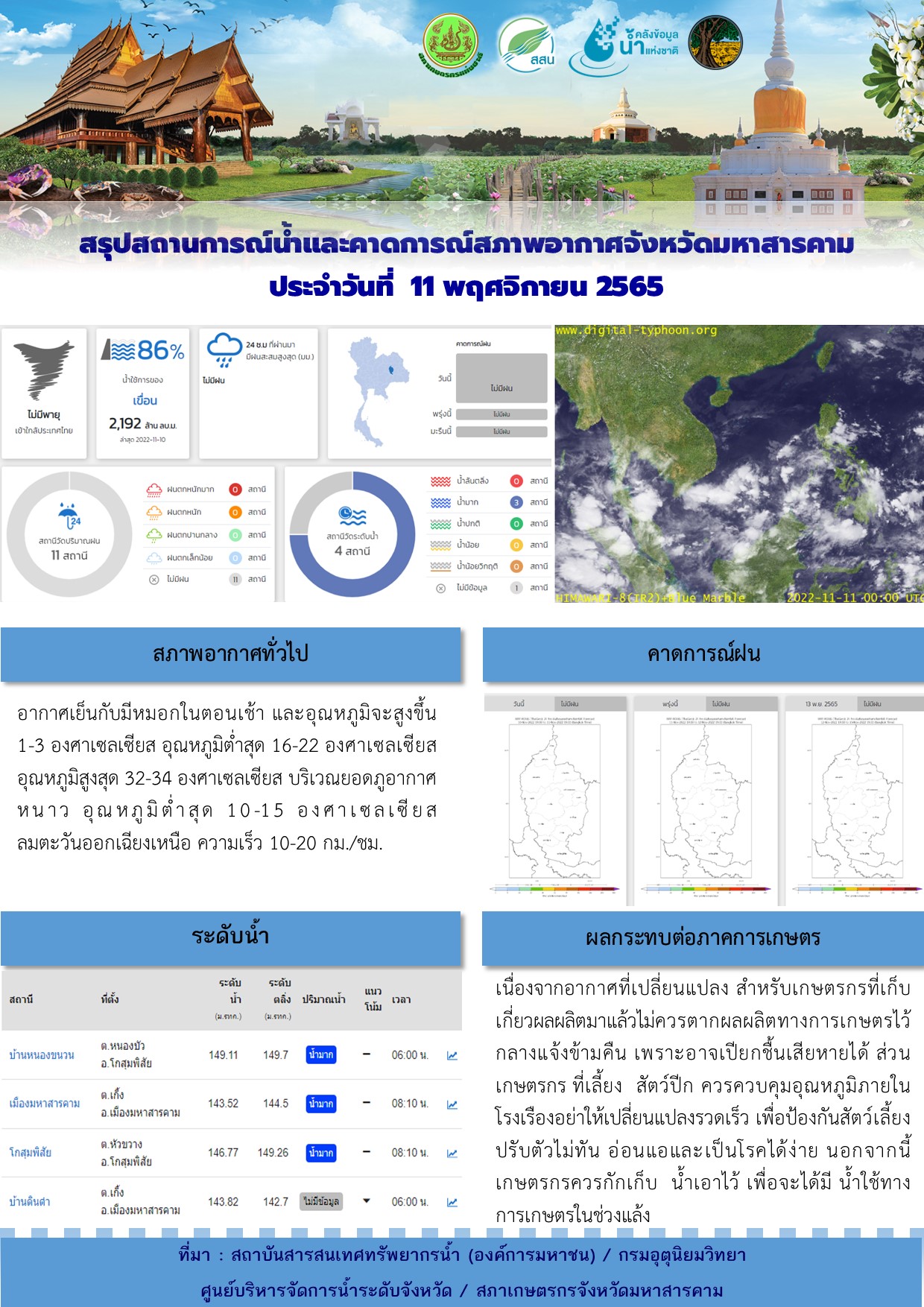 สรุปสถานการณ์น้ำและคาดการณ์สภาพอากาศจังหวัดมหาสารคาม 11 พ.ย. 25657 พ.ย. 2025Adminitratorข่าวกิจกรรม, ข่าวประชาสัมพันธ์