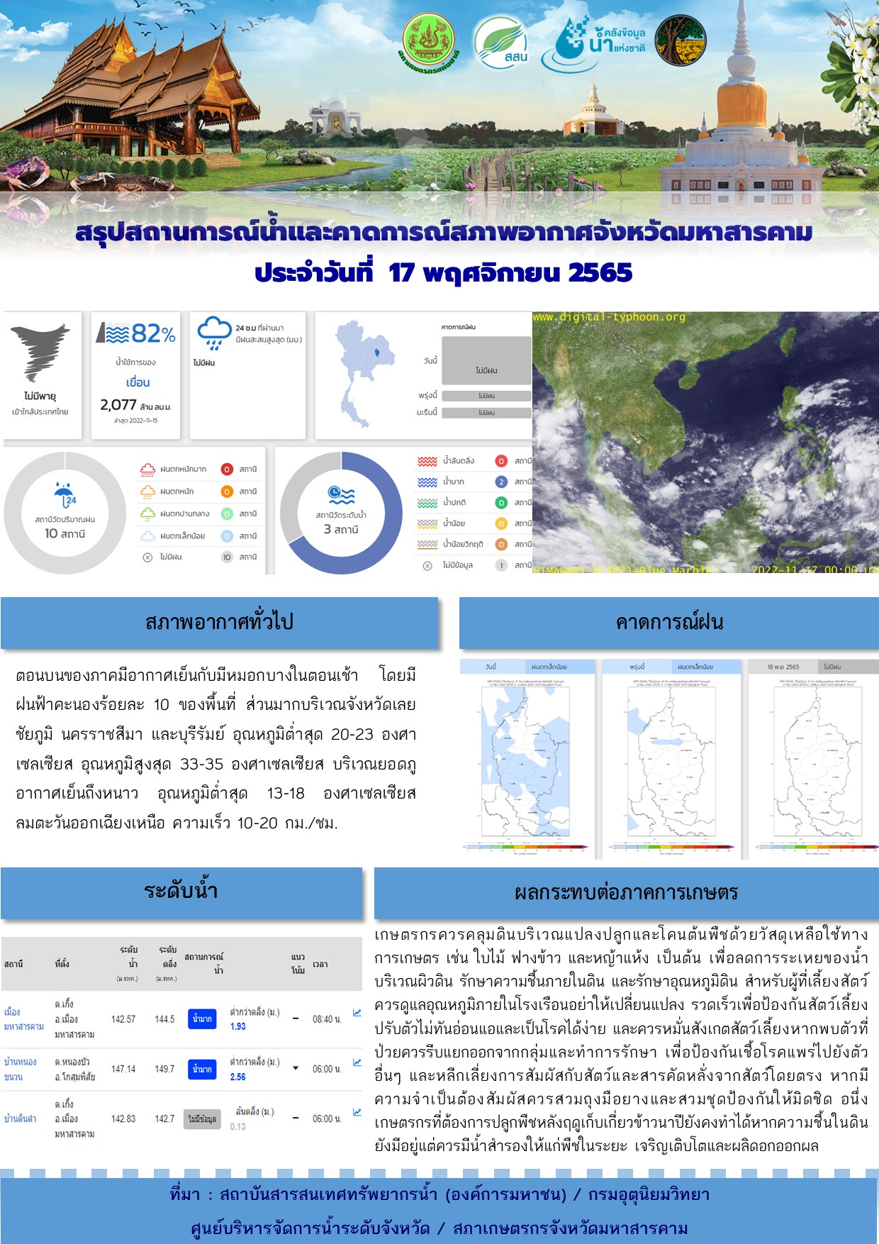 สรุปสถานการณ์น้ำและคาดการณ์สภาพอากาศจังหวัดมหาสารคาม 17 พ.ย. 25657 พ.ย. 2025Adminitratorข่าวกิจกรรม, ข่าวประชาสัมพันธ์