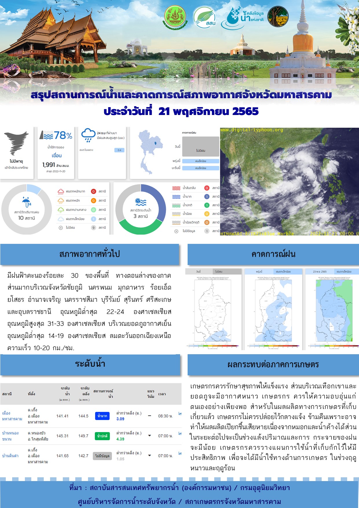 สรุปสถานการณ์น้ำและคาดการณ์สภาพอากาศจังหวัดมหาสารคาม 21 พ.ย. 25657 พ.ย. 2025Adminitratorข่าวกิจกรรม, ข่าวประชาสัมพันธ์