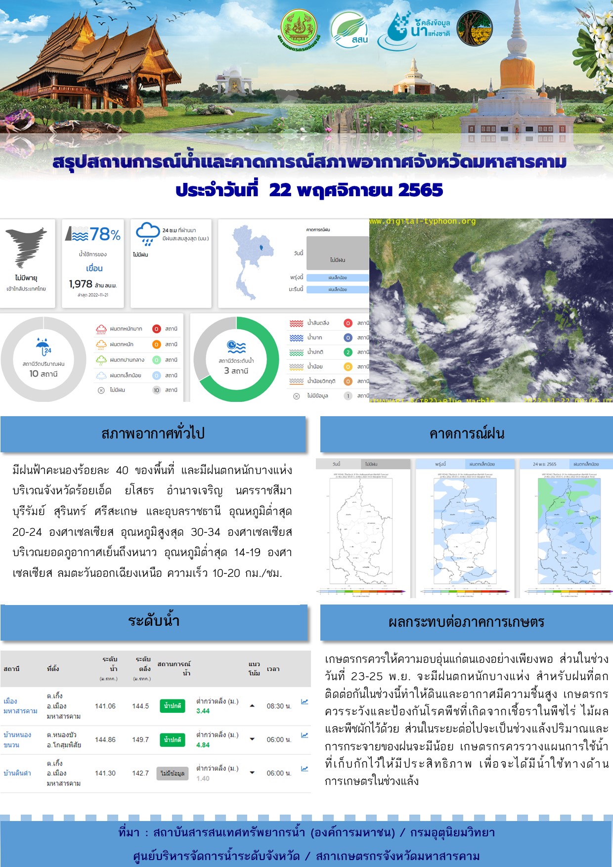 สรุปสถานการณ์น้ำและคาดการณ์สภาพอากาศจังหวัดมหาสารคาม 22 พ.ย. 25657 พ.ย. 2025Adminitratorข่าวกิจกรรม, ข่าวประชาสัมพันธ์
