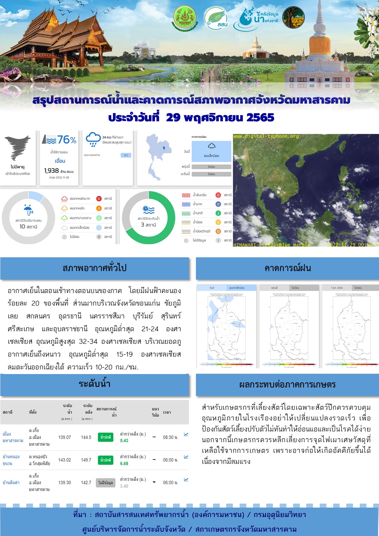 สรุปสถานการณ์น้ำและคาดการณ์สภาพอากาศจังหวัดมหาสารคาม 29 พ.ย. 25657 พ.ย. 2025Adminitratorข่าวกิจกรรม, ข่าวประชาสัมพันธ์