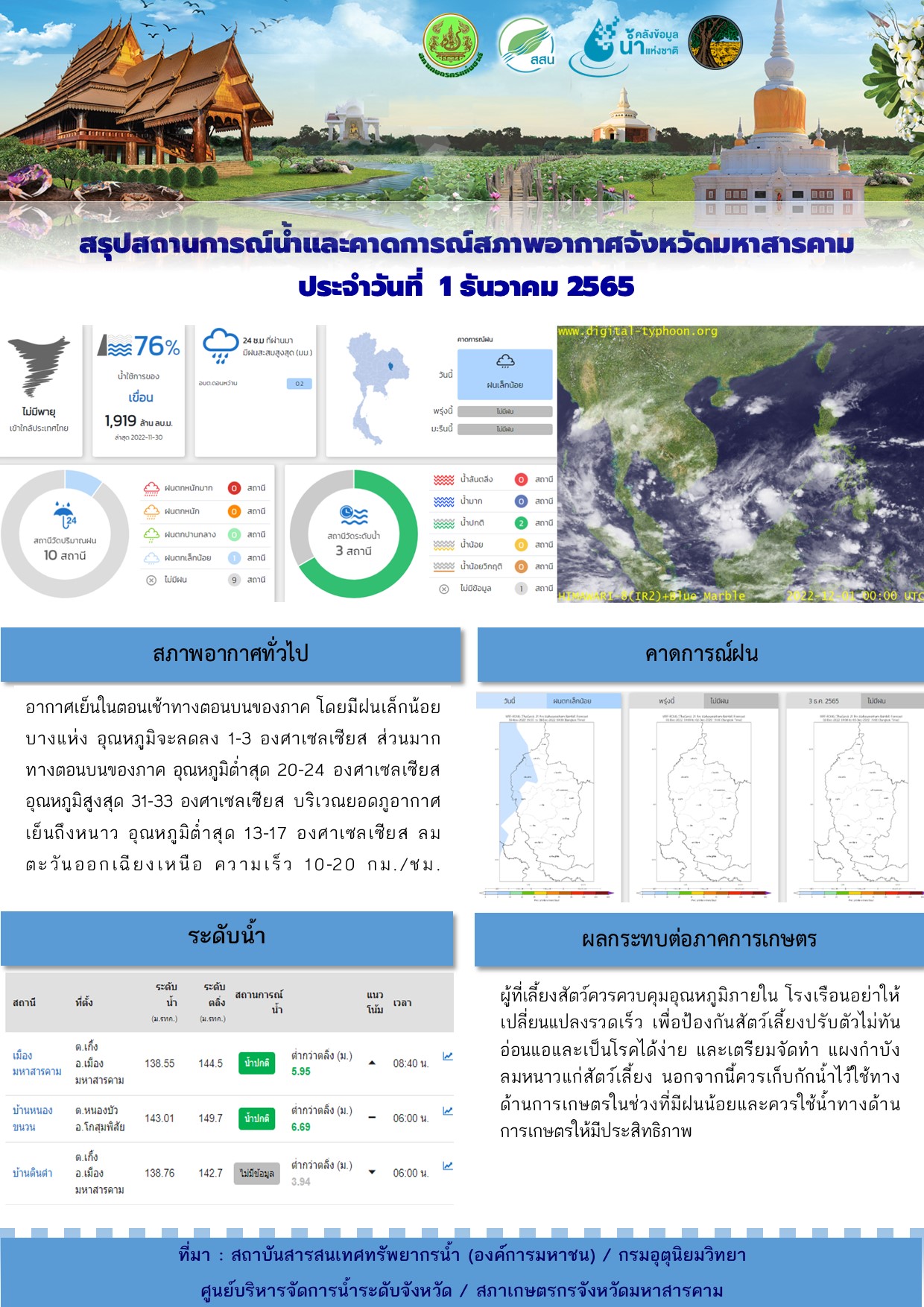 สรุปสถานการณ์น้ำและคาดการณ์สภาพอากาศจังหวัดมหาสารคาม 1 ธ.ค. 25657 พ.ย. 2025Adminitratorข่าวกิจกรรม, ข่าวประชาสัมพันธ์