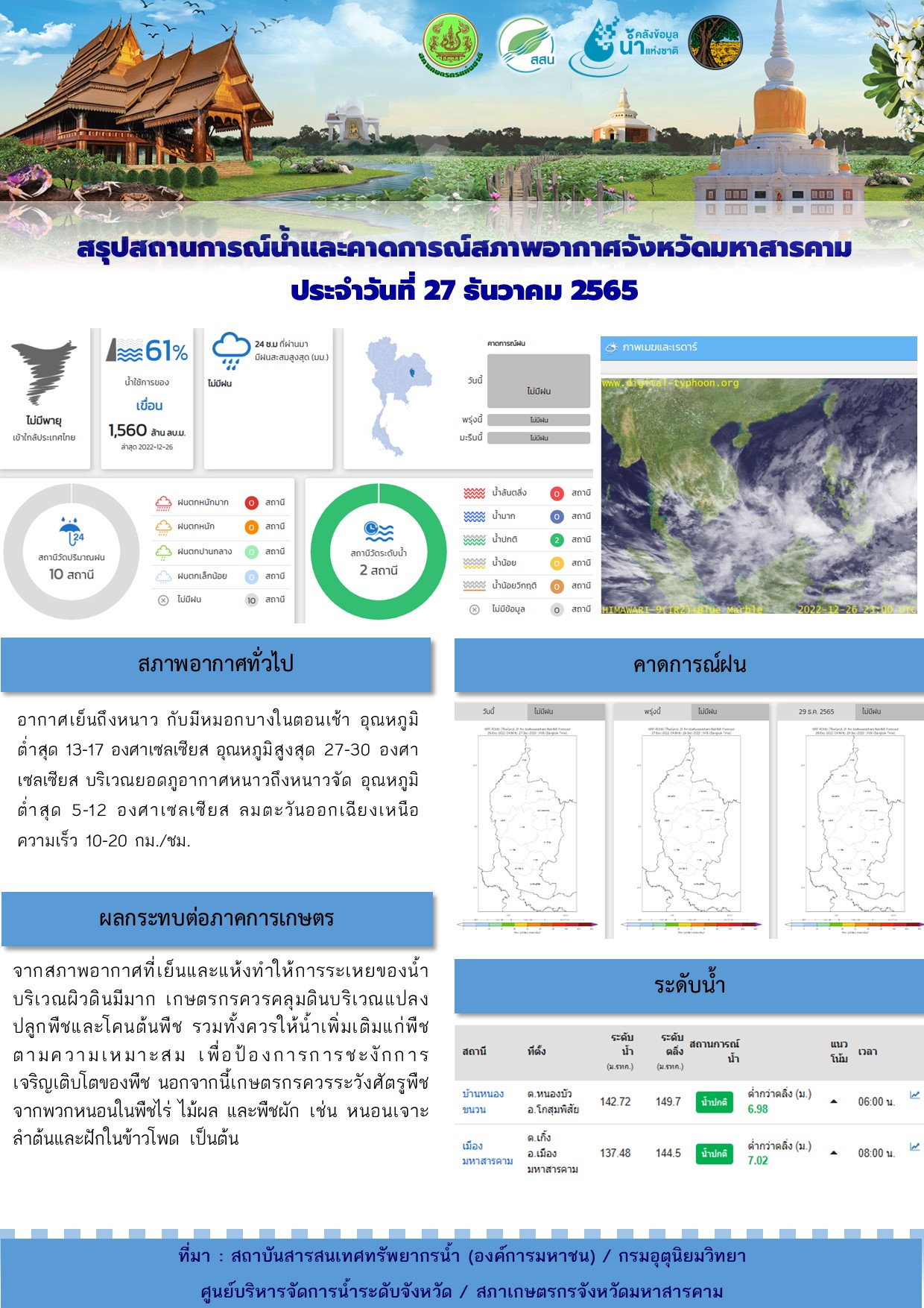 สรุปสถานการณ์น้ำและคาดการณ์สภาพอากาศจังหวัดมหาสารคาม 27 ธ.ค. 25657 พ.ย. 2025Adminitratorข่าวกิจกรรม, ข่าวประชาสัมพันธ์