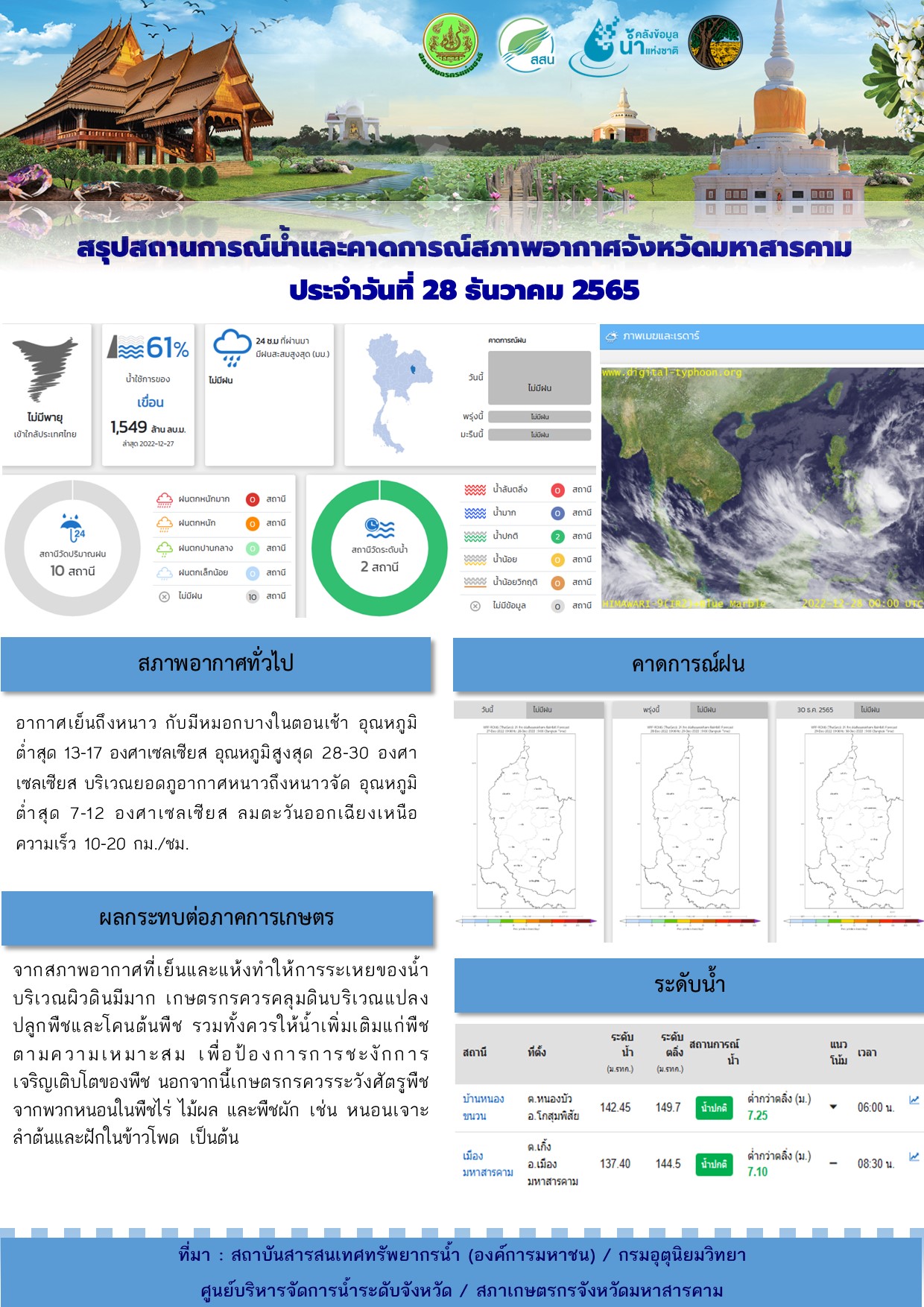 สรุปสถานการณ์น้ำและคาดการณ์สภาพอากาศจังหวัดมหาสารคาม 28 ธ.ค. 25657 พ.ย. 2025Adminitratorข่าวกิจกรรม, ข่าวประชาสัมพันธ์