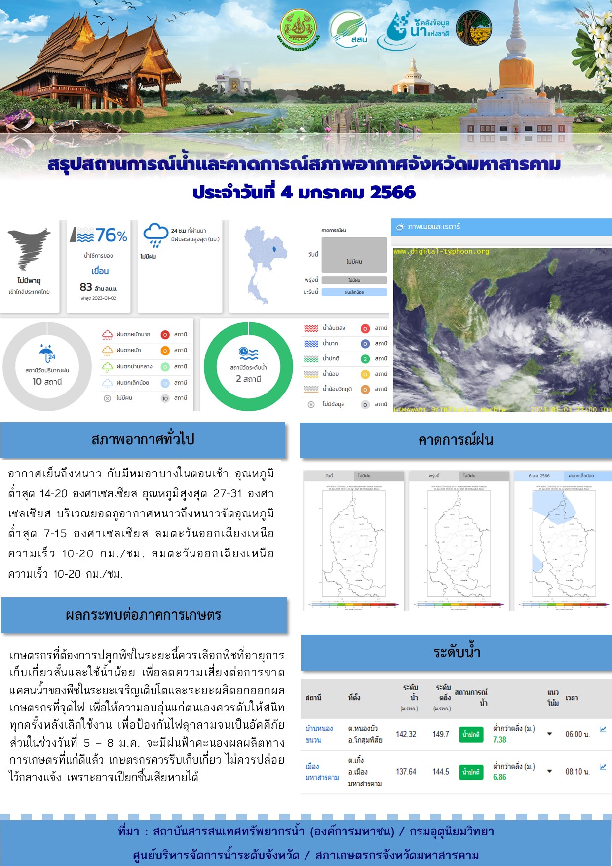 สรุปสถานการณ์น้ำและคาดการณ์สภาพอากาศจังหวัดมหาสารคาม 4 ม.ค. 25667 พ.ย. 2025Adminitratorข่าวกิจกรรม, ข่าวประชาสัมพันธ์